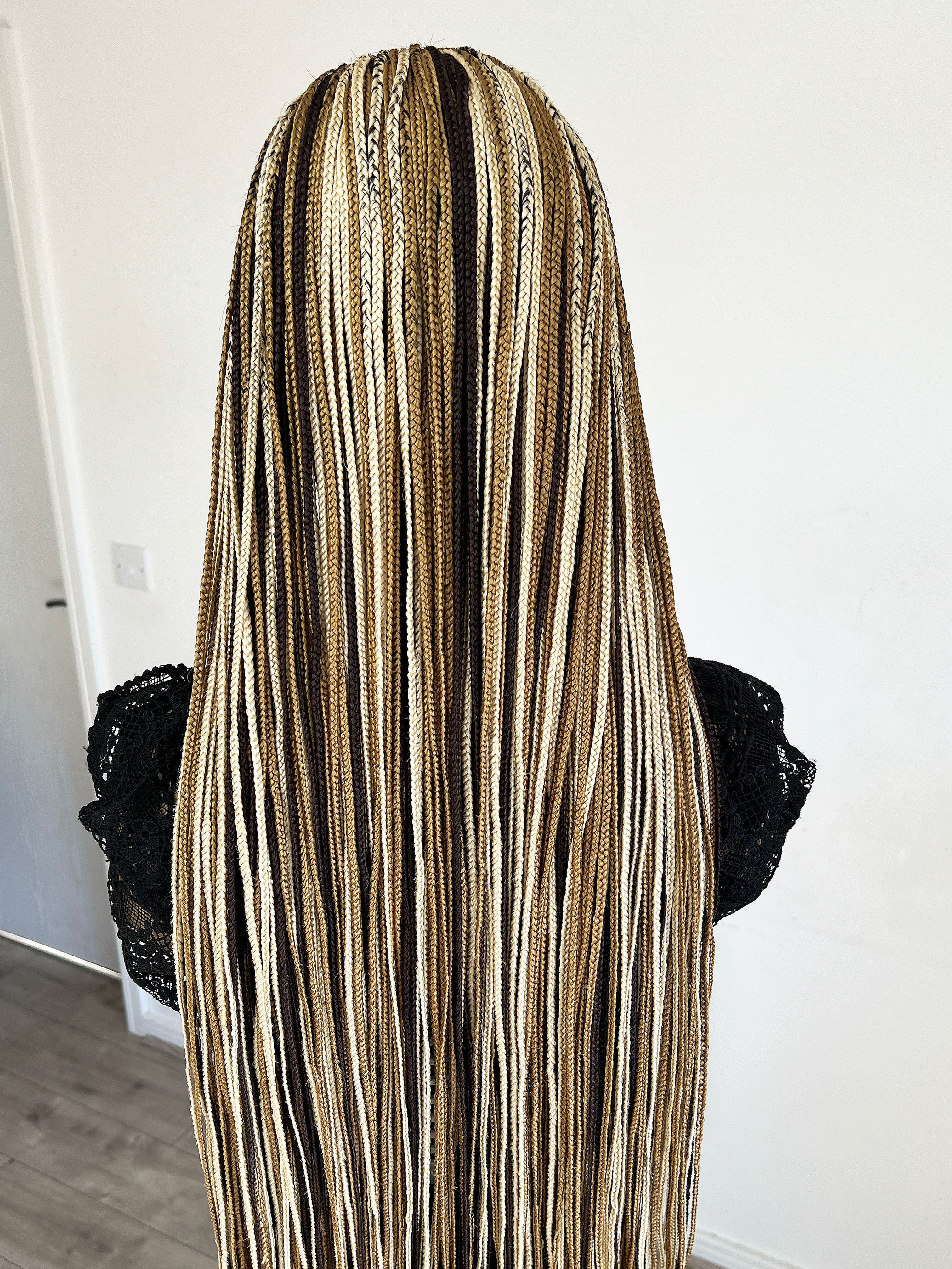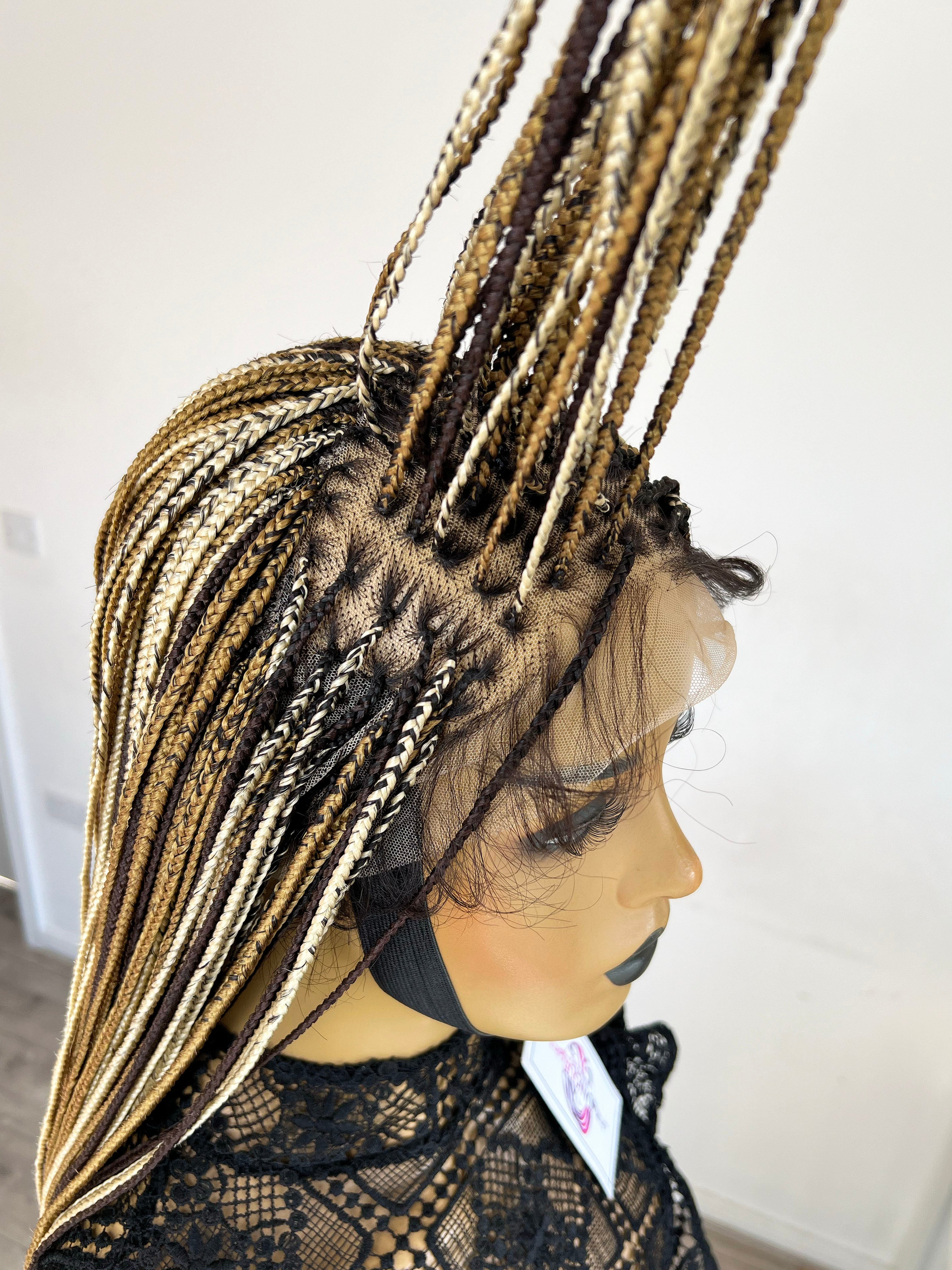 This luxurious Knotless Braided Wig is meticulously handcrafted using high-quality Kanekalon synthetic braiding extensions and a premium lace front, offering a perfect combination of durability and an incredibly realistic appearance.