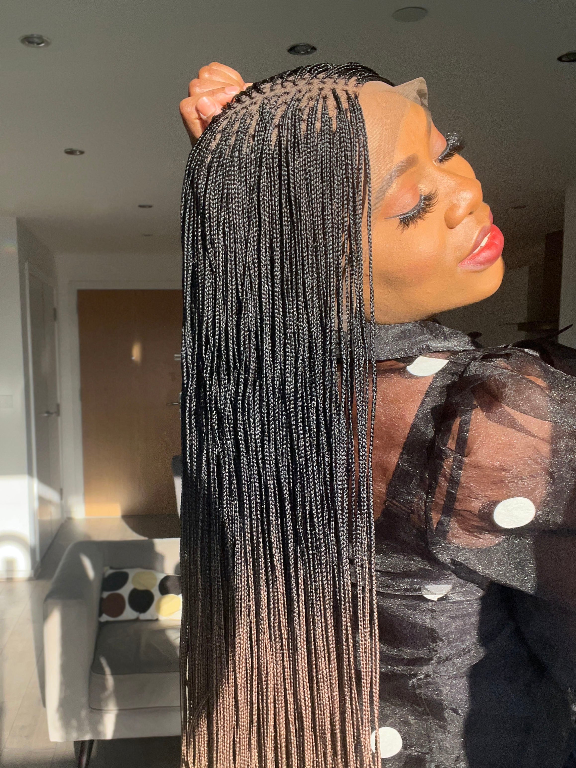 Designed for effortless elegance and long-lasting wear. These beautifully crafted micro Knotless Braided Wig is expertly hand-braided, offering a stunning, natural look with a soft, lightweight feel. Perfect for any occasion—from casual days to formal events—Knotless braids bring a timeless yet modern appeal that complements every face shape and style preference.