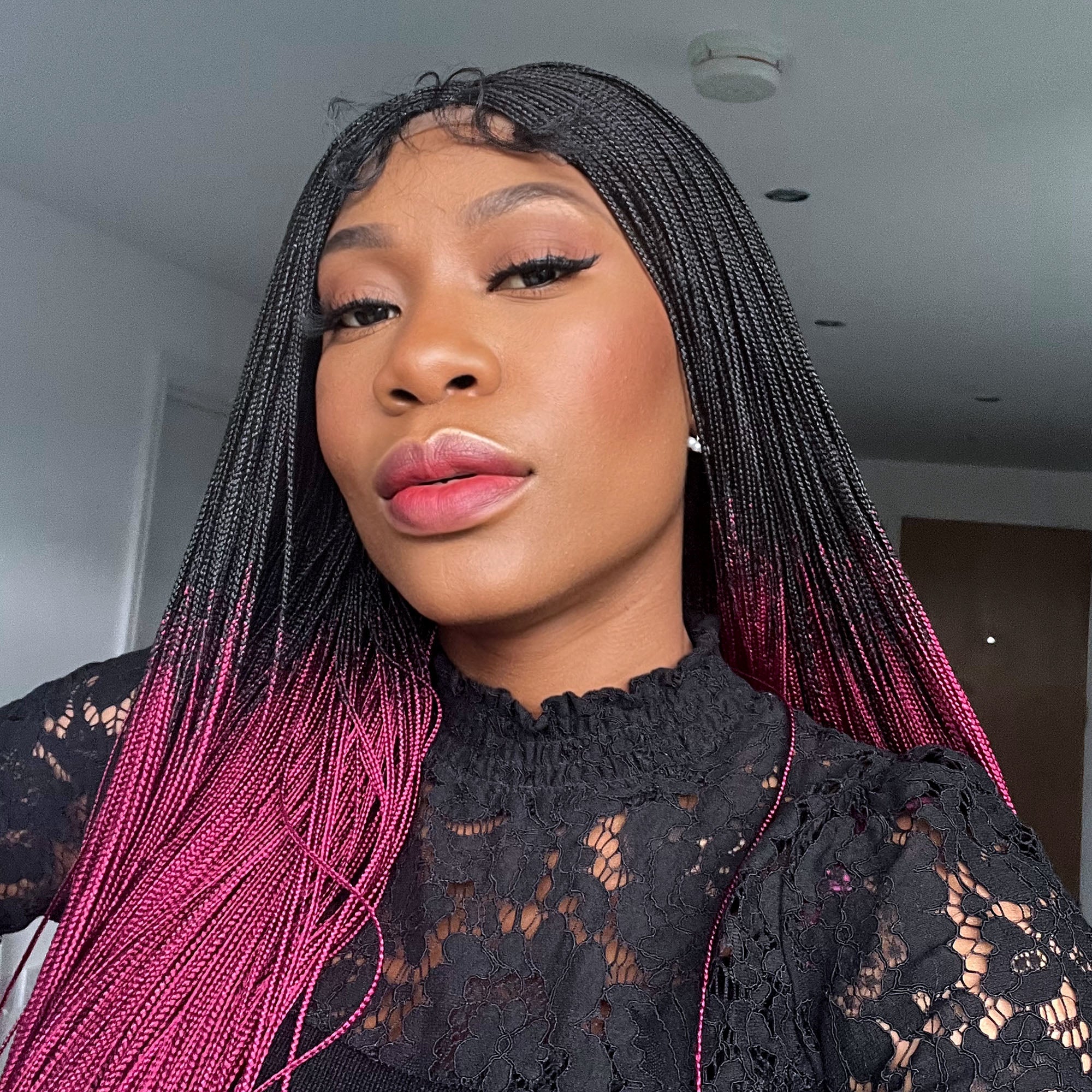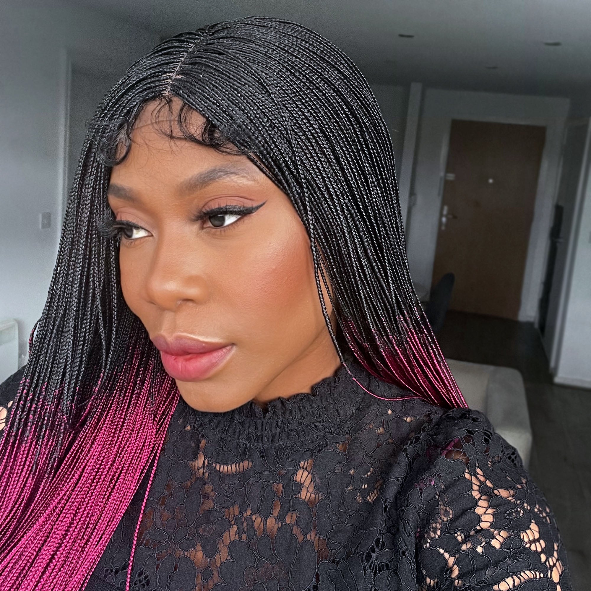 Introducing Our Unique Micro Box Braids Wig in color 1b/Burgundy ombre. Each micro braid strand is expertly handcrafted with precision and great detail. This micro box braids wig is comfortable, lightweight and gives a natural look.